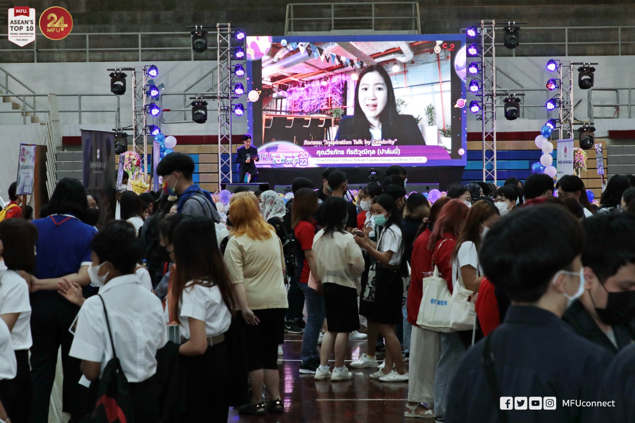 มหาวิทยาลัยแม่ฟ้าหลวง (มฟล.) โดย ส่วนจัดหางานและฝึกงานของนักศึกษา จัดกิจกรรม MFU Internship and Job Fair 2022 ระหว่างวันที่ 25-26 สิงหาคม 2565 โดยวันที่ 25 สิงหาคม เป็นพิธีเปิดและการจัดกิจกรรมในรูปแบบ onsite ณ อาคารเฉลิมพระเกียรติ 72 พรรษา บรมราชินีนาถ และมีพิธีมอบรางวัลสหกิจศึกษาและฝึกประสบการณ์วิชาชีพดีเด่น ประจำปีการศึกษา 2564 รวมทั้งมีเสวนาที่น่าสนใจในห้วข้อ Make the Dream Come True โดยคุณจิรายุส ทรัพย์ศรีโสภา Founder and Group CEO of Bitkub Capital Group Holdings Co., Ltd., หัวข้อ การเปลี่ยนแปลงตลาดแรงงานยุค 4.0 ในโลกอนาคต โดย HR Manager จากบริษัทชั้นนำ และกิจกรรมอื่นๆ อีกมากมาย สำหรับวันที่ 26 สิงหาคมเป็นกิจกรรมเสวนาในรูปแบบ online
