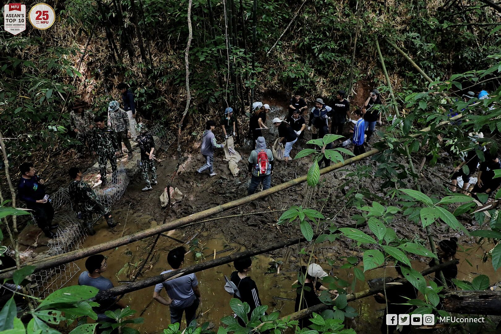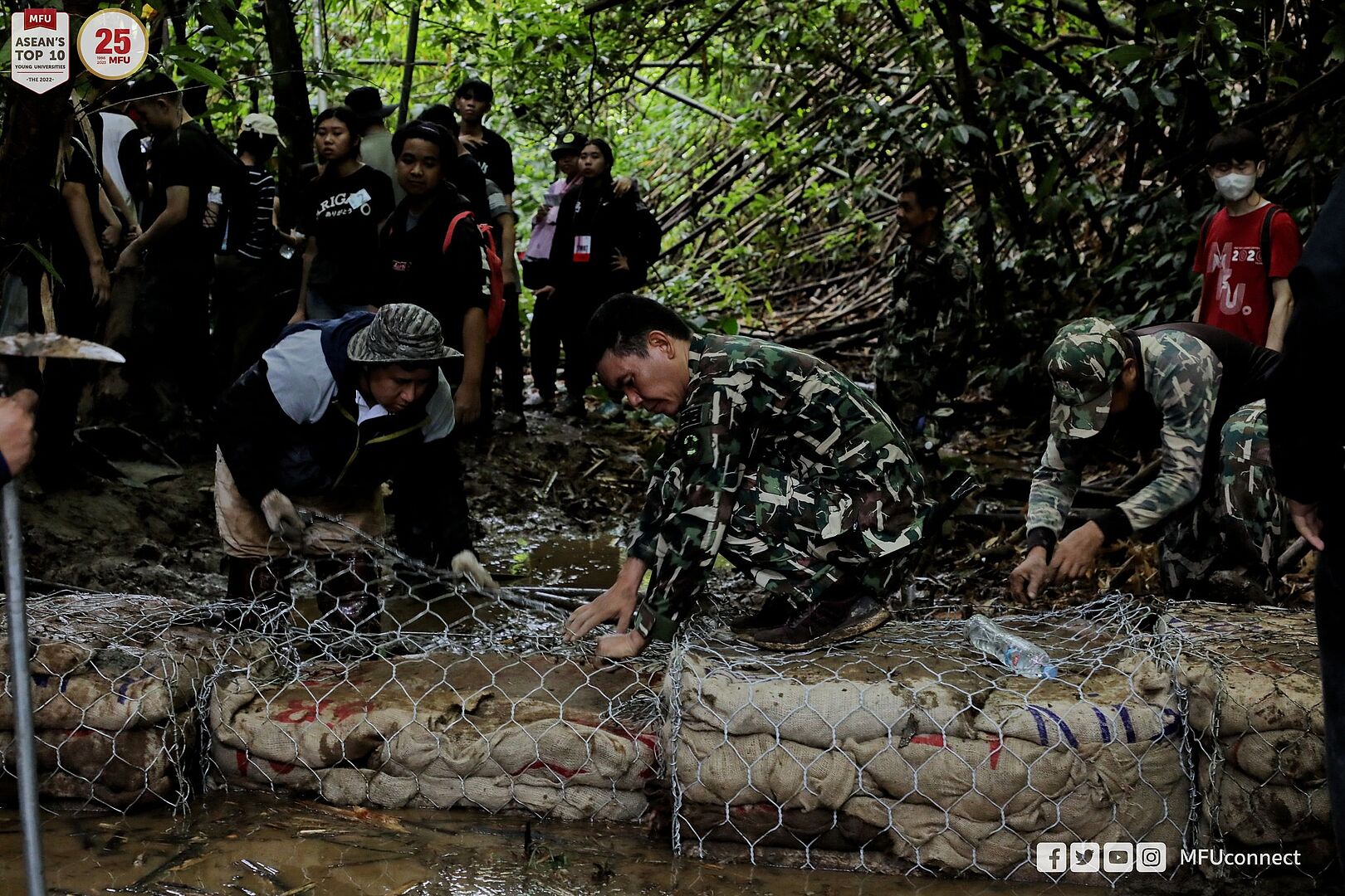 จากนั้นนักศึกษาและเจ้าหน้าที่นั่งรถขึ้นเขาไปยังจุดรวมพลเพื่อเตรียมวัสดุอุปกรณ์ในการสร้างฝายชะลอน้ำ โดยมี อาจารย์สุรสิทธิ์ ปุสุรินทร์คำ จากวิทยาลัยอาชีวศึกษาเชียงราย ผู้เชี่ยวชาญการสร้างฝาย รับหน้าที่เป็นวิทยากร อธิบายความสำคัญของการสร้างฝายชะลอน้ำในพื้นที่ป่าธรรมชาติ ที่จะช่วยรักษาความชุ่มชื้นให้กับพื้นที่ป่าจากฤดูน้ำหลากไปจนถึงฤดูแล้ง และการสร้างฝายอย่างถูกวิธีที่เป็นมิตรกับเส้นทางน้ำผ่านและพื้นที่ป่าธรรมชาติ เมื่อมีพื้นที่ชุ่มน้ำก็จะเกิดคุณประโยชน์ต่าง ๆ ต่อเนื่องไป ทั้งสร้างความอุดมสมบูรณ์ให้ผืนป่า ความชุ่มชื้นสร้างแหล่งอาหาร เป็นถิ่นที่อยู่ของสัตว์นานาชนิด รวมถึงเป็นแนวกันไฟป่าอีกทางหนึ่ง ซึ่งนักศึกษาแบ่งออกเป็น 5 กลุ่ม เดินลำเลียงอุปกรณ์ไปยังพื้นที่เป้าหมายระยะทาง 1 กิโลเมตร โดยผ่านเส้นทางป่าธรรมชาติ ตาน้ำ จนไปถึงจุดที่จะทำฝายกั้นบริเวณร่องน้ำไหลผ่าน จากนั้นแต่ละกลุ่มทำการขุดดินเพื่อผสมกับปูนซีเมนต์ ตักใส่ถุงกระสอบ แล้วนำไปเรียงใส่กล่องลวดสานขนาดใหญ่ที่เรียงตัวเป็นโครงสร้างฝายขนาดย่อม