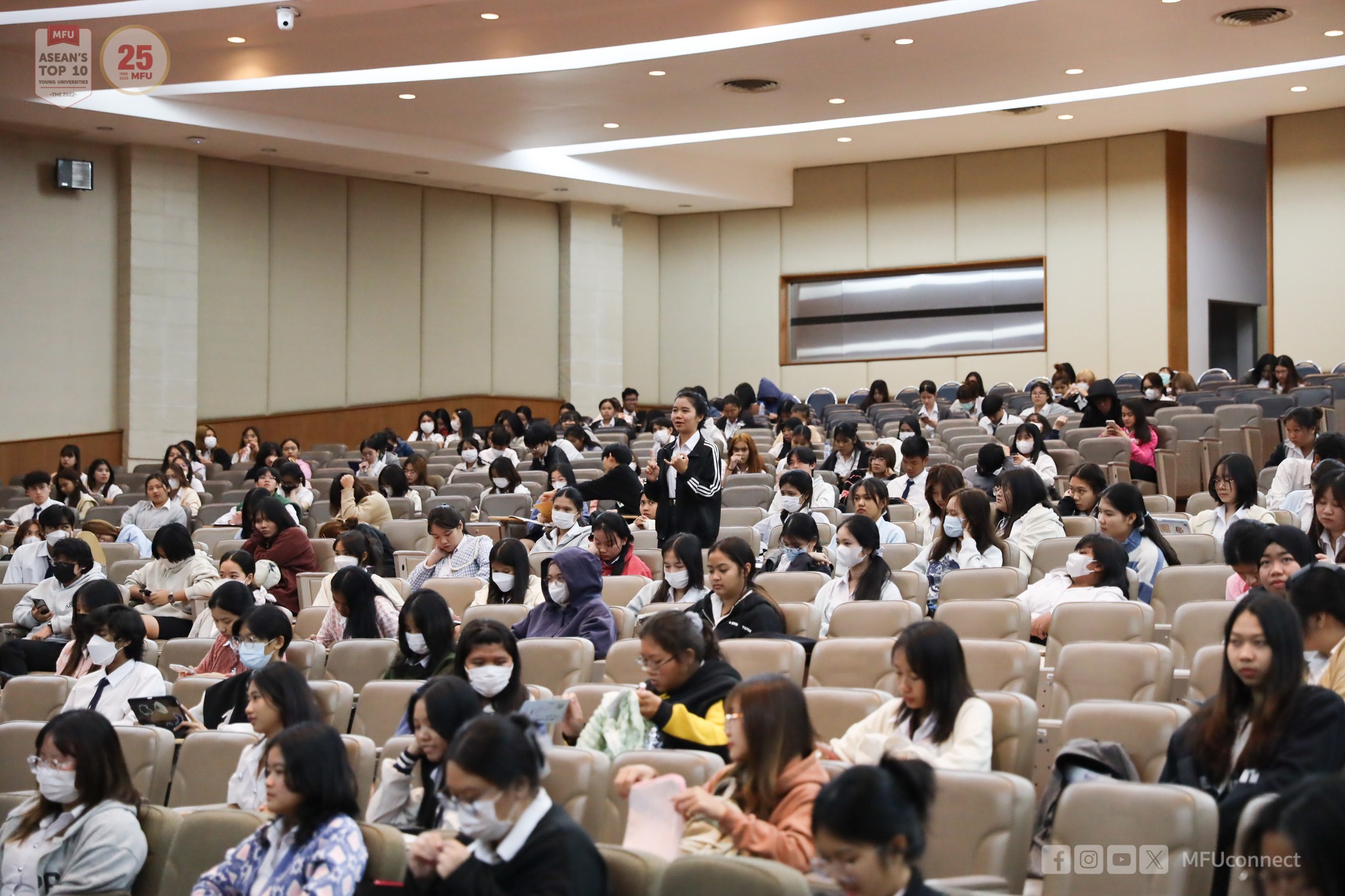 มหาวิทยาลัยแม่ฟ้าหลวง (มฟล.) โดย ฝ่ายทุนการศึกษา ส่วนพัฒนานักศึกษา ได้จัดการประชุมนักศึกษากองทุนเงินให้กู้ยืมเพื่อการศึกษา ประจำปีการศึกษา 2566 เพื่อสร้างความรู้ความเข้าใจและตระหนักถึงความสำคัญในการกู้ยืมเงินเพื่อการศึกษา พร้อมทั้งรายละเอียดข้อควรระวังในการใช้จ่ายทุน และการชำระหนี้ทุนหลังสำเร็จการศึกษา ตามระยะเวลาและเงื่อนไขที่กำหนด เพื่อให้เงินทุนเกิดประโยชน์สูงสุดตามวัตถุประสงค์ของกองทุน และยังเป็นการส่งต่อโอกาสให้แก่รุ่นน้องที่มีความจำเป็นในการกู้ยืมเงินเรียนในรุ่นต่อ ๆ ไป โดยมี ผศ. ดร.ณัฐกาญจน์ รุ่งเรือง ผู้ช่วยอธิการบดี มฟล. กล่าวเปิดการประชุม เมื่อวันอาทิตย์ที่ 26 พฤศจิกายน 2566 ณ หอประชุมสมเด็จย่า (C4) มหาวิทยาลัยแม่ฟ้าหลวง