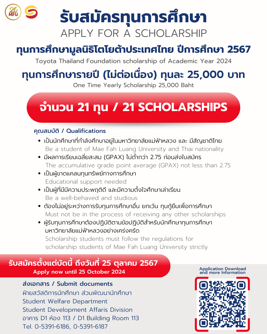 รับสมัคร ทุนการศึกษามูลนิธิโตโยต้าประเทศไทย มหาวิทยาลัยแม่ฟ้าหลวง ประจำปีการศึกษา 2567