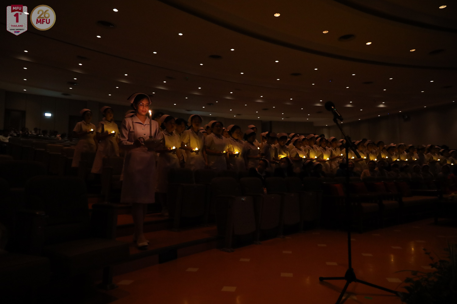 ต่อมา เข้าสู่พิธีจุดดวงประทีป ตัวแทนคณาจารย์ทำหน้าที่ดุจ Miss Florence Nightingale จุดตะเกียงให้แก่นักศึกษาที่เข้าร่วมพิธี แสงสว่างจากตะเกียงเปรียบดังดวงประทีปแทนความห่วงใยเมตตาจากพยาบาลที่มอบให้แก่คนไข้ ขับไล่ความมืดมิดที่เปรียบเป็นความเจ็บปวดและทุกข์ทรมานจากอาการป่วยไข้ เหล่านักศึกษาพยาบาลในหอประชุมสมเด็จย่าร่วมขับขานบทเพลงมาร์ชพยาบาล ที่สืบสานพระราชปณิธานจากพระราชบิดาและสมเด็จย่า ในการเห็นประโยชน์คนไข้เป็นที่หนึ่ง จากนั้นนักศึกษาที่ร่วมพิธีถือดวงประทีปเคลื่อนขบวนออกจากหอประชุมสมเด็จย่า และร่วมพิธีกล่าวปฏิญาณตนต่อหน้าพระราชานุสาวรีย์สมเด็จพระศีนครินทราบรมราชชนนี เป็นอันเสร็จสิ้นพิธีการ จากนั้นนักศึกษาพยาบาลร่วมถ่ายภาพหมู่กับเหล่าคณาจารย์ และถ่ายภาพร่วมกับครอบครัวที่เดินทางมาร่วมแสดงความยินดี