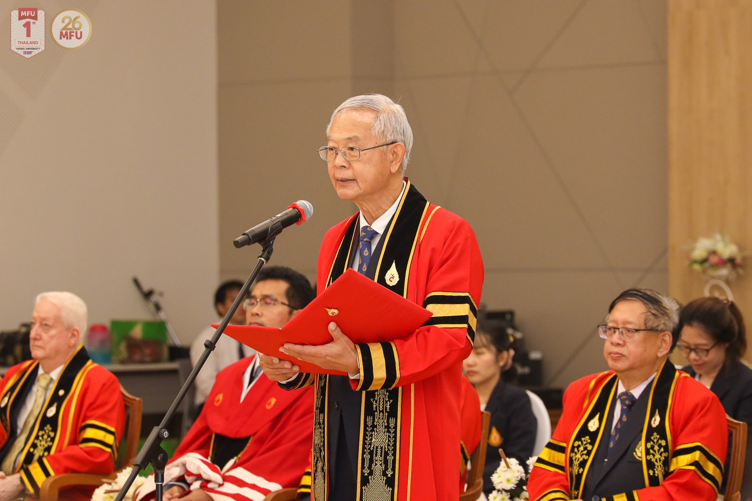 “ในวันนี้ คาปฏิญาณที่พวกท่านจะกล่าวนั้น เป็นสิ่งที่จะสะท้อนถึงการตั้งมั่นที่จะยึดถือในความซื่อสัตย์สุจริต และการรับใช้สังคมด้วยความรับผิดชอบสูงสุด ซึ่งเป็นหัวใจสาคัญของการเป็นแพทย์ ข้าพเจ้าเชื่อมั่นว่าทุกท่านจะสามารถนาคามั่นสัญญานี้ไปปฏิบัติจริงในชีวิตและการทางานของท่าน”