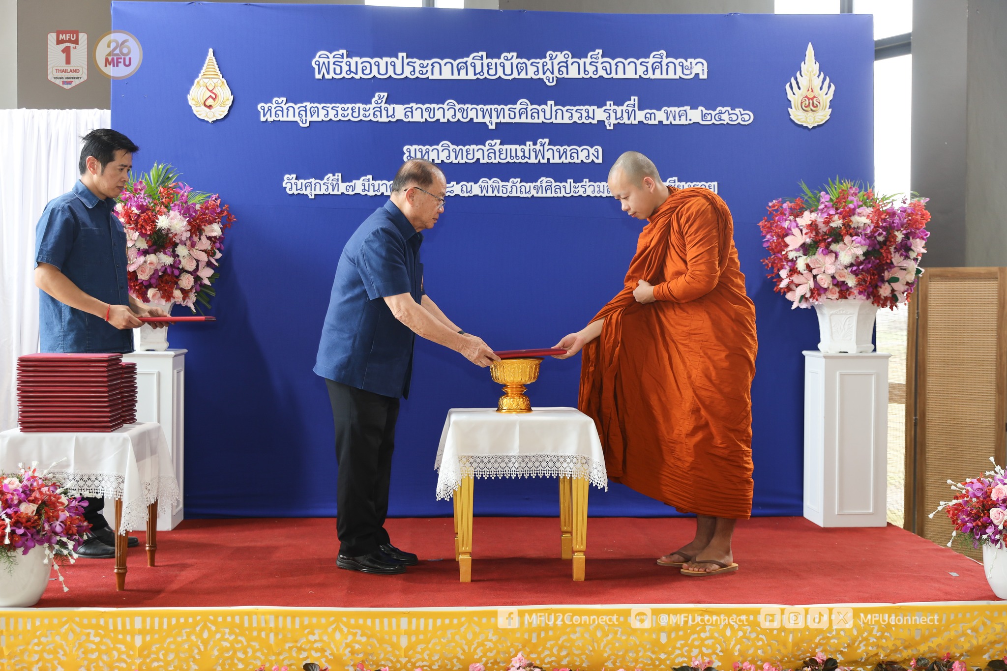 เมื่อวันศุกร์ที่ 7 มีนาคม 2568 มหาวิทยาลัยแม่ฟ้าหลวง (มฟล.) โดยหลักสูตรระยะสั้น สาขาวิชาพุทธศิลปกรรม และศูนย์บริการวิชาการ จัดพิธีมอบประกาศนียบัตรผู้สำเร็จการศึกษาหลักสูตรระยะสั้น สาขาวิชาพุทธศิลปกรรม มหาวิทยาลัยแม่ฟ้าหลวง รุ่นที่ 3 พ.ศ. 2566 และพิธีเปิดนิทรรศการศิลปะ "การตื่นรู้ทางจิตวิญญาณพุทธศิลป์" โดยเป็นผลงานของผู้เรียนหลักสูตรระยะสั้น สาขาวิชาพุทธศิลปกรรม ร่วมกับผู้ทรงคุณวุฒิและอาจารย์ประจำหลักสูตร ณ พิพิธภัณฑ์ร่วมสมัยเมืองเชียงราย (Chiang Rai Contemporary Art Museum) โดยได้รับเกียรติจาก ศาสตราจารย์พิเศษ ดร.วันชัย ศิริชนะ นายกสภามหาวิทยาลัยแม่ฟ้าหลวง เป็นประธานในพิธีมอบประกาศนียบัตรและกล่าวให้โอวาทแก่ผู้สำเร็จหลักสูตร ผู้ช่วยศาสตราจารย์ ดร.มัชฌิมา นราดิศร อธิการบดี กล่าวรายงานผลดำเนินการ อาจารย์ ดร.ณัฐวุฒิ ยอดสุวรรณ ผู้อำนวยการศูนย์บริการวิชาการ ขานรายชื่อผู้สำเร็จการศึกษาหลักสูตร รุ่นที่ 3 ที่เข้าร่วมพิธีมอบประกาศนียบัตร จำนวน 32 รูป/คน จากผู้สำเร็จหลักสูตรทั้งสิ้น 40 รูป/คน