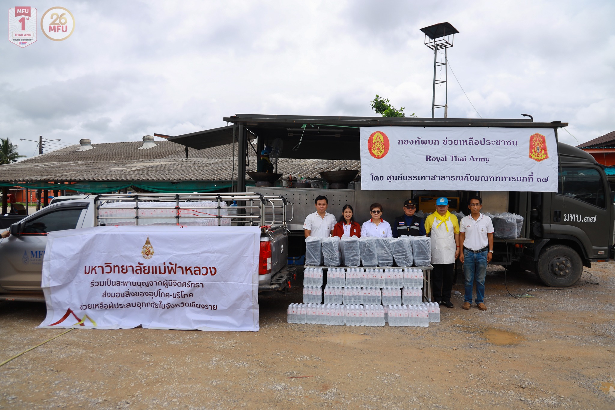 เมื่อวันที่ 28 มิถุนายน 2568 มหาวิทยาลัยแม่ฟ้าหลวง (มฟล.) นำโดย ผู้ช่วยศาสตราจารย์ ดร.ณัฐพรพรรณ อุตมา รองอธิการบดี นางกัลยา สุวรรณภักดี ผู้ช่วยอธิการบดี พร้อมด้วยคณะผู้แทนจากมหาวิทยาลัย ลงพื้นที่อำเภอพญาเม็งราย จังหวัดเชียงราย เพื่อส่งมอบน้ำดื่ม 2,400 ขวด และข้าวกล่องจำนวน 300 กล่อง ให้แก่ประชาชนที่ได้รับผลกระทบจากสถานการณ์อุทกภัยในพื้นที่พญาเม็งราย