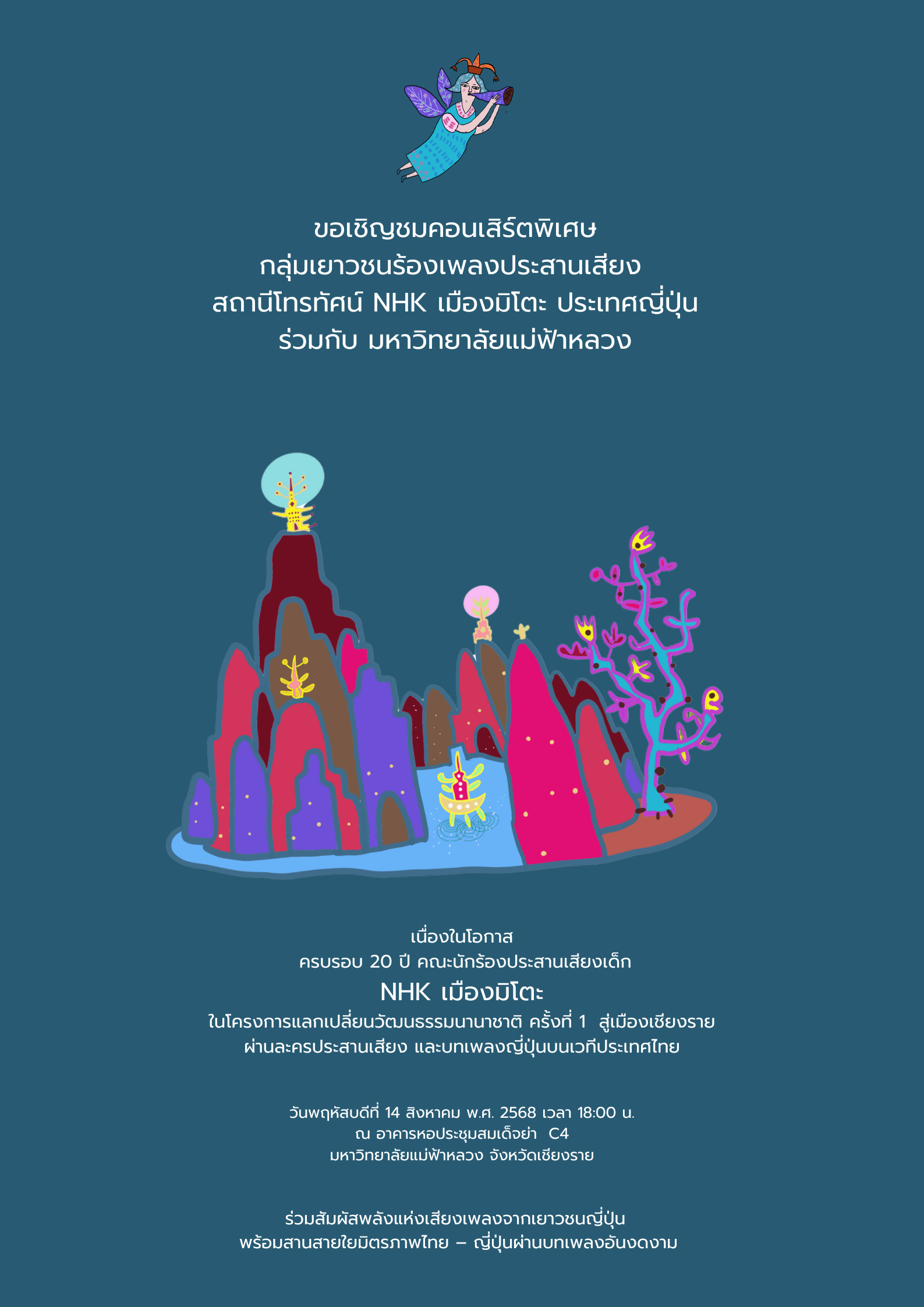 ขอเชิญชมคอนเสิร์ตพิเศษ กลุ่มเยาวชนร้องเพลงประสานเสียง สถานีโทรทัศน์ NHK เมืองมิโตะ ประเทศญี่ปุ่น ร่วมกับ มหาวิทยาลัยแม่ฟ้าหลวง (มฟล.) เนื่องในโอกาสครบรอบ 20 ปี คณะนักร้องประสานเสียงเด็ก NHK เมืองมิโตะ ในโครงการแลกเปลี่ยนวัฒนธรรมนานาชาติ ครั้งที่ 1 “สู่เมืองเชียงราย ผ่านละครประสานเสียงและบทเพลงญี่ปุ่นบนเวทีประเทศไทย”