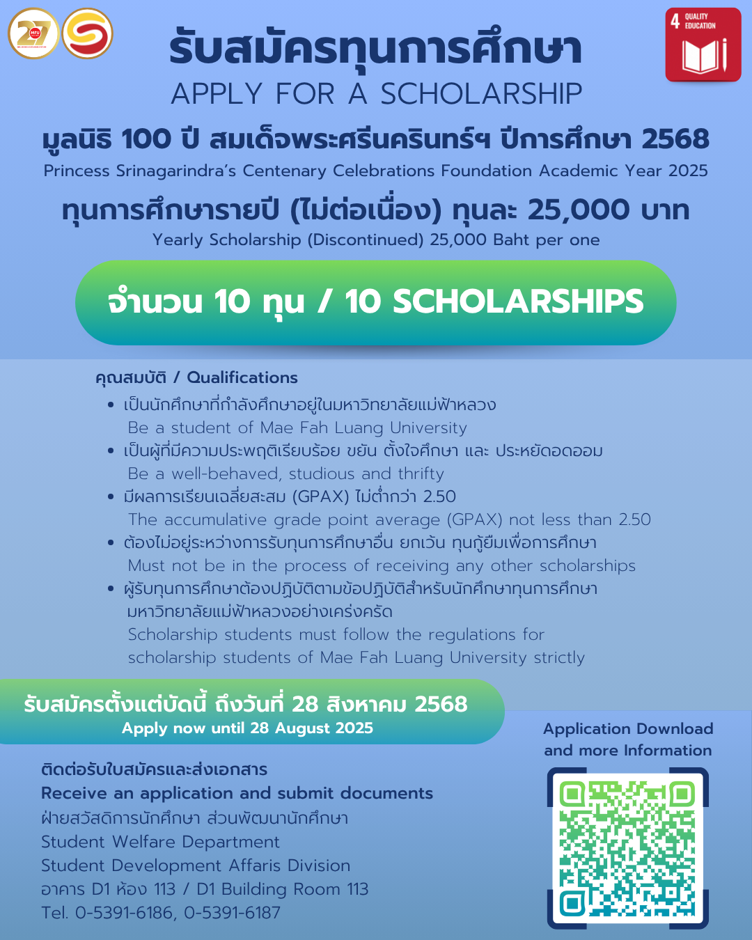 5. Scholarship students must follow the regulations for scholarship students of Mae Fah Luang University