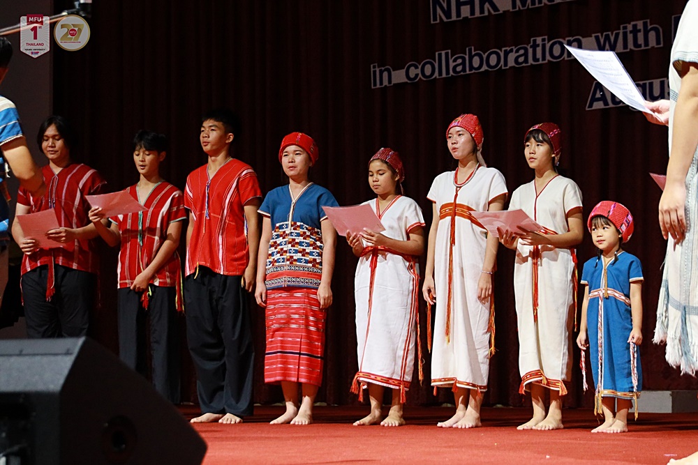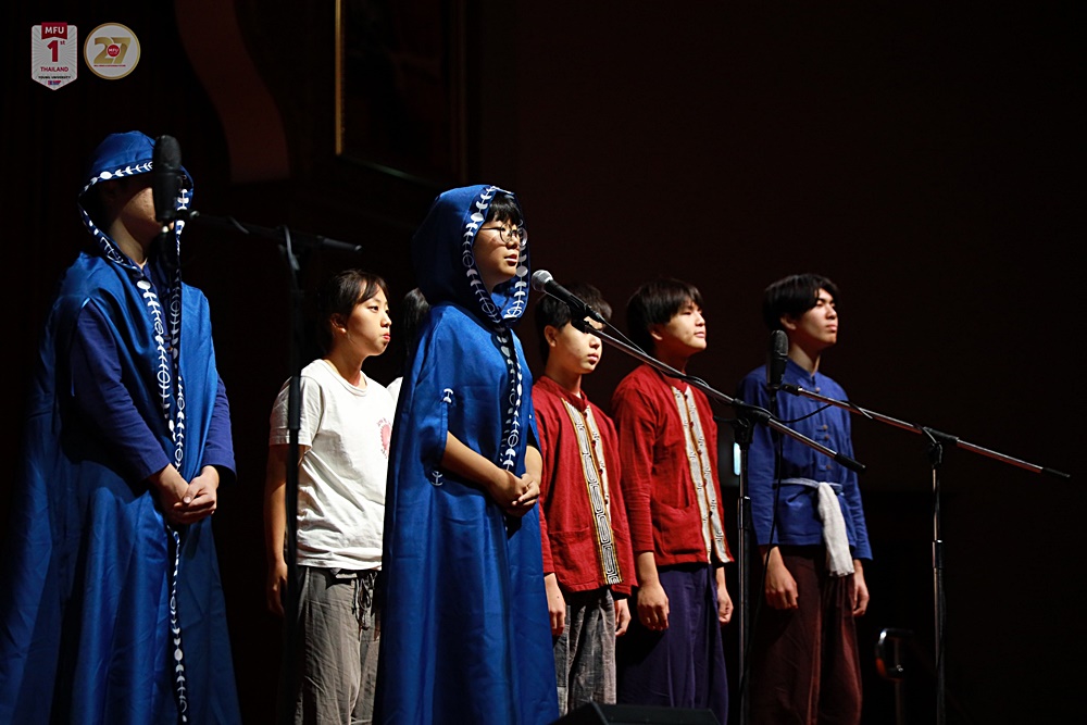 จากนั้นเริ่มการแสดง Musical : Son of Spirit ละครเพลง “ซาน – บุตรแห่งจิตวิญญาณ” ที่สร้างจากเหตุการณ์จริงถ้ำหลวง จ.เชียงราย ผสมผสานกับตำนาน “ขุนน้ำนางนอน” ถ่ายทอดเรื่องราวความรัก ความสูญเสีย และสายสัมพันธ์ข้ามกาลเวลา ผ่านบทเพลงประสานเสียงและการแสดงอันงดงาม ต่อด้วยการแสดงดนตรีชาติพันธุ์ร่วมสมัย เพลงประสานเสียงเยาวชนปกาเกอะญอ การร้องประสานเสียงจาก MFU Band และการร่วมแสดงดนตรี ระหว่าง คณะนักร้องประสานเสียงเยาวชน NHK เมืองมิโตะ ประเทศญี่ปุ่น-กลุ่มประสานเสียงเยาวชนปกาเกอะญอ-วงดนตรีมหาวิทยาลัยแม่ฟ้าหลวง (MFU Band)