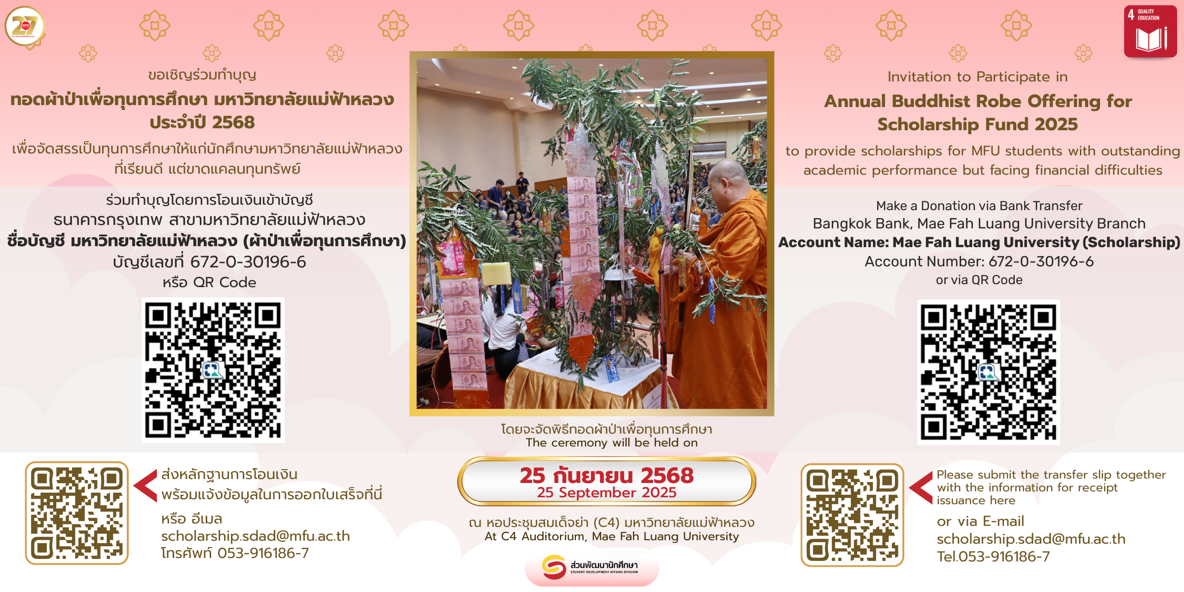 Invitation to Join the Annual Buddhist Robe Offering for Scholarship Fund 2025 for MFU students with outstanding academic performance but facing financial difficulties.