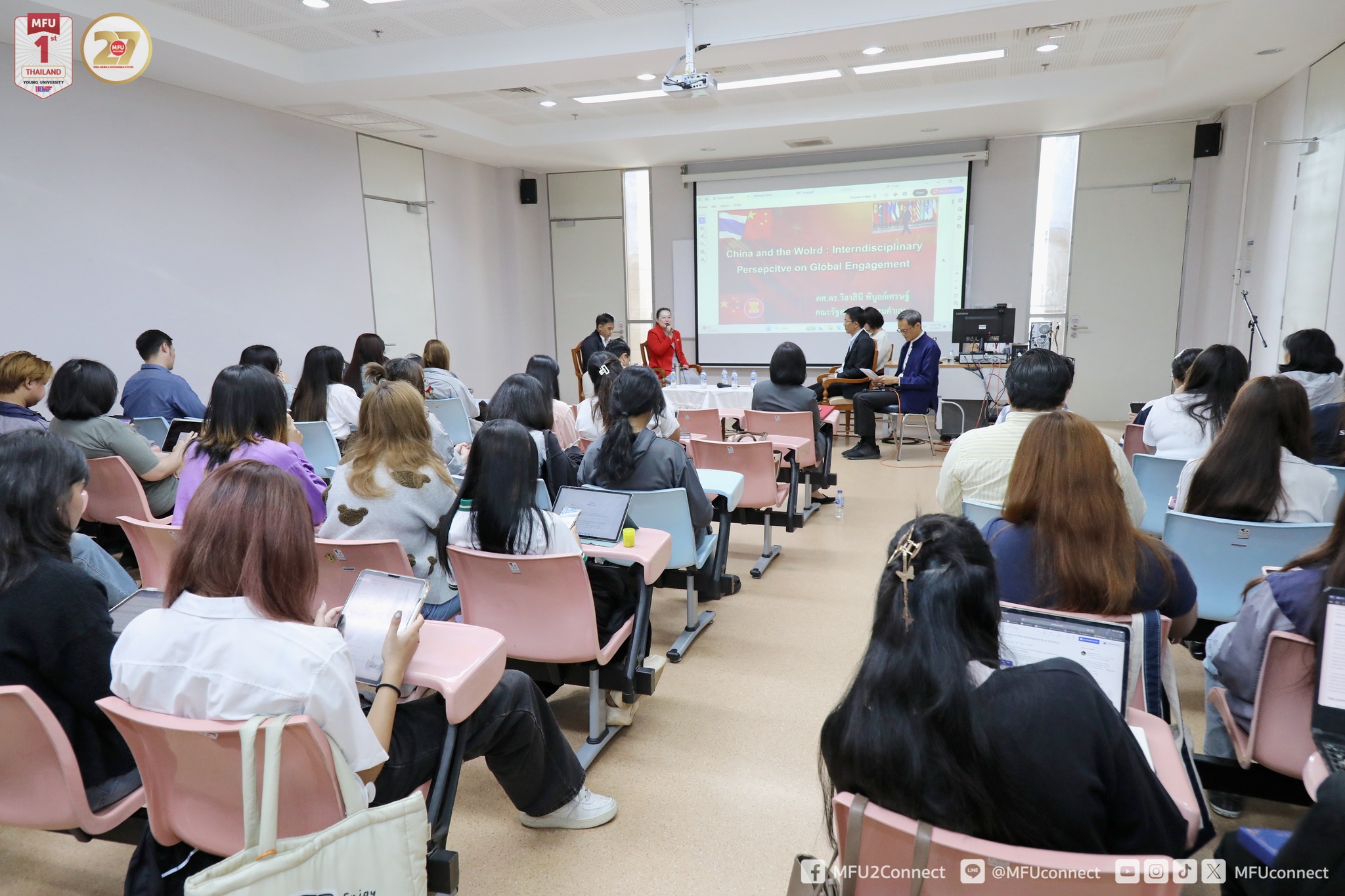 เมื่อวันที่ 1 กันยายน 2568 ศูนย์วิจัยเอเชียเพื่อการพัฒนาระหว่างประเทศ สำนักวิชานวัตกรรมสังคม มหาวิทยาลัยแม่ฟ้าหลวง (มฟล.) จัดกิจกรรมเสวนาวิชาการเรื่อง “มุมมองสหวิทยาการกับพลวัตรของจีนและบทบาทในการเป็นหุ้นส่วนเพื่อการพัฒนาในเวทีโลก” ณ ห้อง E4 608 อาคารพลเอกสำเภา ชูศรี (E4) โดยมีคณาจารย์ นักศึกษา และผู้สนใจเข้าร่วม กิจกรรมครั้งนี้จัดขึ้นเพื่อเฉลิมฉลองในโอกาสครบรอบ 50 ปี การสถาปนาความสัมพันธ์ทางการทูตระหว่างไทยและจีน