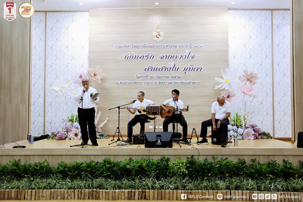 วันศุกร์ที่ 19 กันยายน 2568 เวลา 08.30 – 11.00 น. มหาวิทยาลัยแม่ฟ้าหลวงจัดงาน “มุทิตาจิต ผู้เกษียณอายุการทำงาน ประจำปี พ.ศ. 2568” “ถักทอรัก จากดวงใจ สานสายใจ มุทิตา” ณ ห้องคำมอกหลวง เพื่อเป็นการประกาศเกียรติคุณและแสดงมุทิตาคารวะแก่ผู้ปฏิบัติงานที่ครบกำหนดเกษียณอายุ ซึ่งได้สร้างคุณประโยชน์และความเจริญก้าวหน้าแก่สถาบัน พร้อมทั้งส่งเสริมวัฒนธรรมองค์กรที่ตระหนักถึงคุณค่าของบุคลากร โดยมี ผศ. ดร.มัชฌิมา นราดิศร อธิการบดี เป็นประธานในพิธี