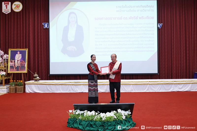 รางวัลใบประกาศเกียรติคุณพนักงานดีเด่น สายวิชาการได้แก่ รองศาสตราจารย์ ดร.พัชรีย์ พริบดีเวช สำนักวิชาวิทยาศาสตร์ ผู้มีความโดดเด่นทั้งด้านการสอน การวิจัย การบริการวิชาการ และการพัฒนานักศึกษา มีผลงานวิจัยคุณภาพสูงที่ได้รับการยอมรับในระดับนานาชาติ โดยเฉพาะงานด้านวิทยาศาสตร์สิ่งแวดล้อม เช่น การศึกษาฝุ่น PM 2.5 และการปนเปื้อนโลหะหนักในแม่น้ำกก