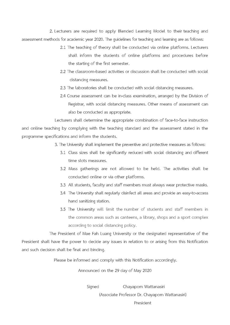 Notification of MFU Operational Guidelines for Academic Year 2020
