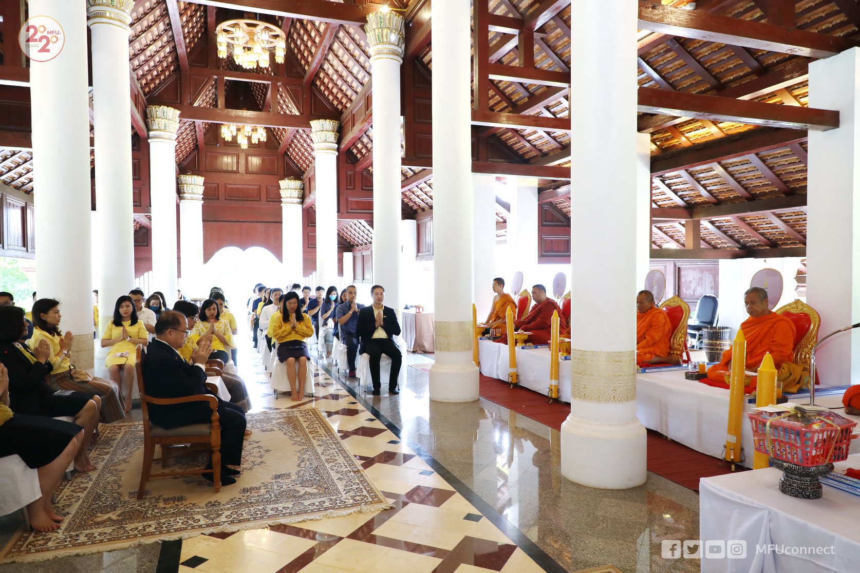 มหาวิทยาลัยแม่ฟ้าหลวง (มฟล.) โดย ส่วนสารบรรณ อำนวยการและนิติการ จัดพิธีถวายเทียนพรรษาและผ้าอาบน้ำฝน ประจำปี 2563 เมื่อวันศุกร์ที่ 3 กรกฎาคม 2563 ณ วิหารพระเจ้าล้านทองเฉลิมพระเกียรติฯ โดยมี รศ.ดร.วันชัย ศิริชนะ นายกสภามหาวิทยาลัย เป็นประธานในพิธี พร้อมด้วย รศ.ดร.ชยาพร วัฒนศิริ อธิการบดี และผู้บริหาร พนักงาน นักศึกษา เข้าร่วมพิธี ทั้งนี้ พิธีเริ่มในเวลา 15.00 น. ประธานในพิธีจุดธูปเทียนบูชาพระรัตนตรัย พิธีกรนำไหว้พระและอาราธนาศีล ประธานสงฆ์ให้ศีล จากนั้นเป็นการบรรยายธรรมเรื่องอานิสงส์แห่งการถวายเทียนพรรษาและผ้าอาบน้ำฝน จบแล้วพิธีกรนำกล่าวคำถวายเทียนพรรษาและผ้าอาบน้ำฝน ผู้บริหารถวายเทียนพรรษาและผ้าอาบน้ำฝนแด่พระสงฆ์จาก 7 วัดโดยรอบมหาวิทยาลัย พร้อมทั้งชุดหลอดไฟและปัจจัย พระสงฆ์อนุโมทนา เป็นอันเสร็จสิ้นพิธี